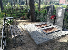 На данном участке клиент пожелал вместо уже существующего оформления места захоронения изготовить два симметричных памятника и покрыть территорию рядом с ними брусчаткой.